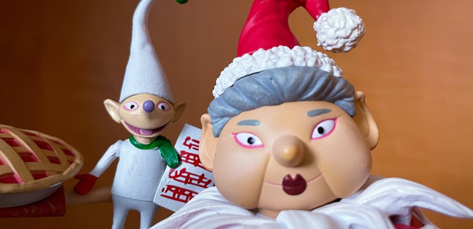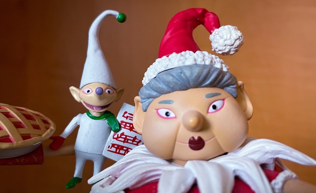 The Mrs. Claus figure comes with a few additional accessories: Choir Elf, Penguin on a Pie, and a Pie.