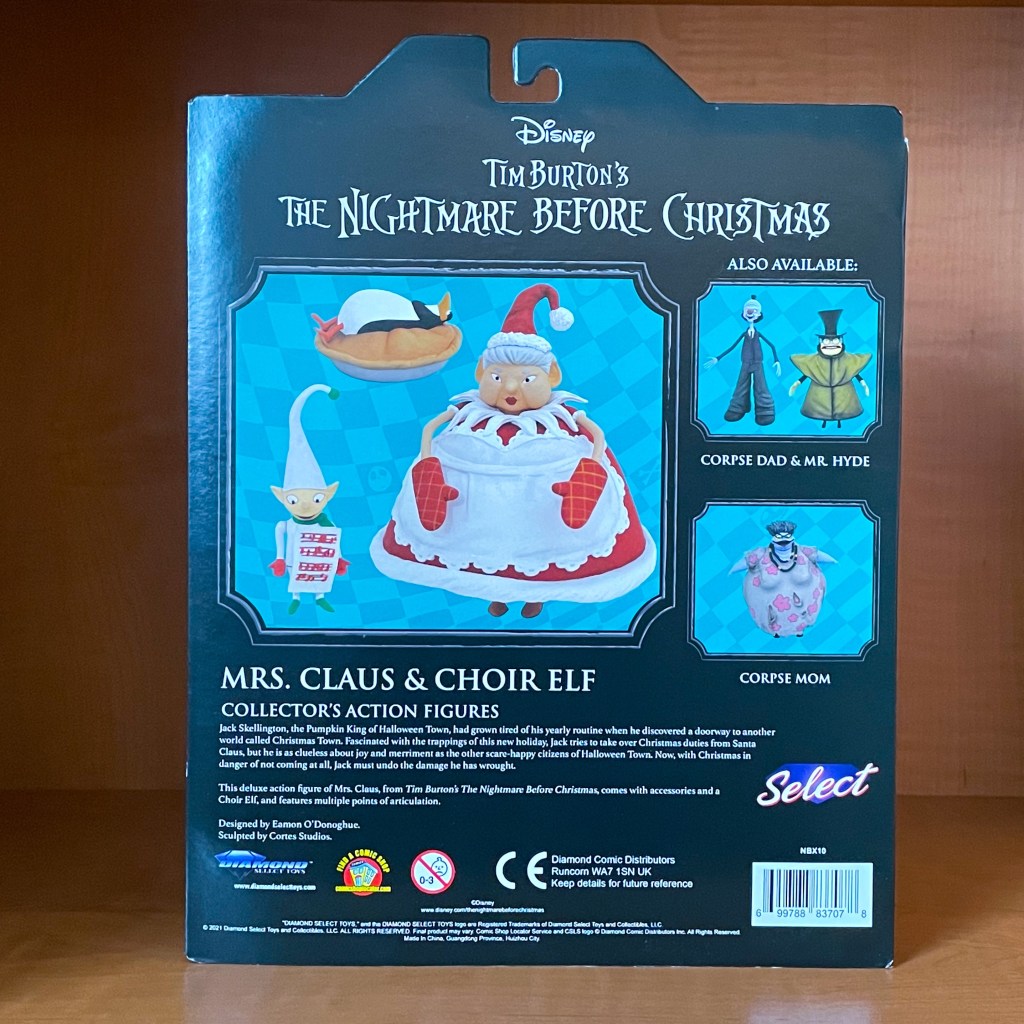 Diamond Select Toys brings a deep cut to their The Nightmare Before Christmas Series 10 of figures with a Mrs. Claus figure. Making figures of some of the characters that may not have gotten much screen time in The Nightmare Before Christmas film is what has really excelled this figure product line by DST. Mrs. Claus appears for a few brief seconds in the film as she is baking snacks for Santa’s lunchbox before he is kidnapped by Lock, Shock, and Barrel. Mrs. Claus also appears in The Nightmare Before Christmas sequel comic book, “Zero’s Journey”.