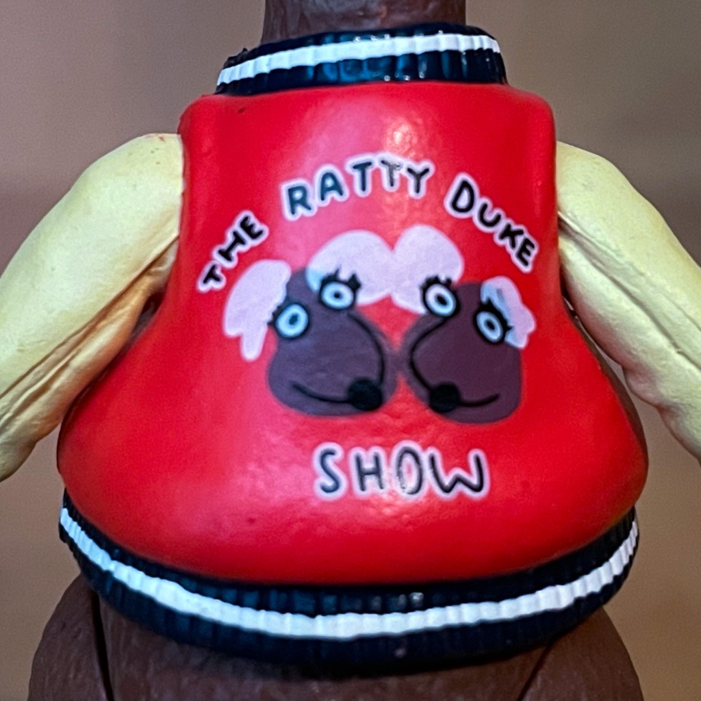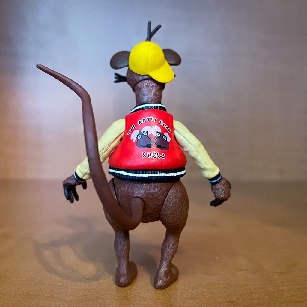 The pizza rat has six points of articulation including his head, arms (2), legs (2), and tail. The back of his jacket has The Ratty Duke Show logo.