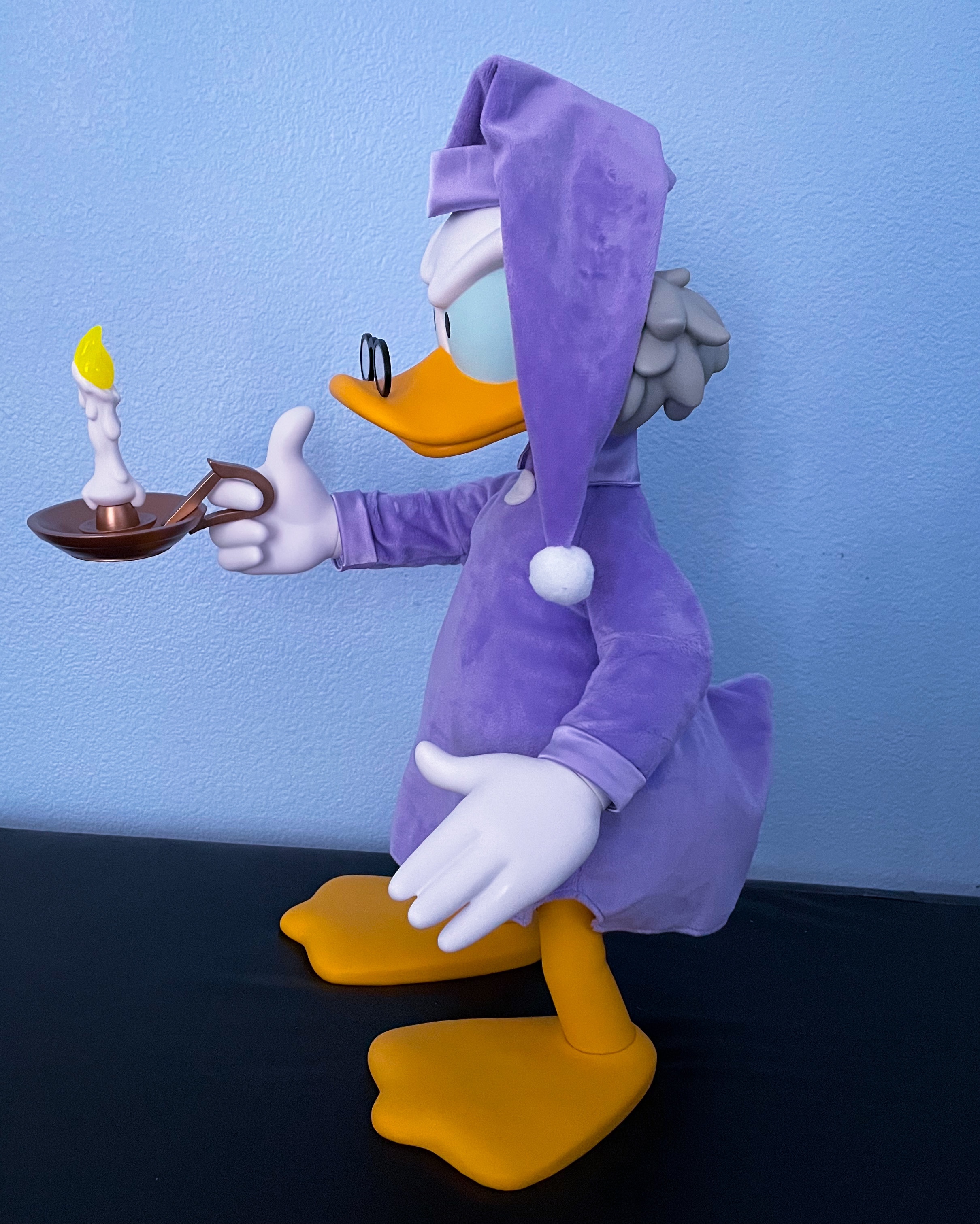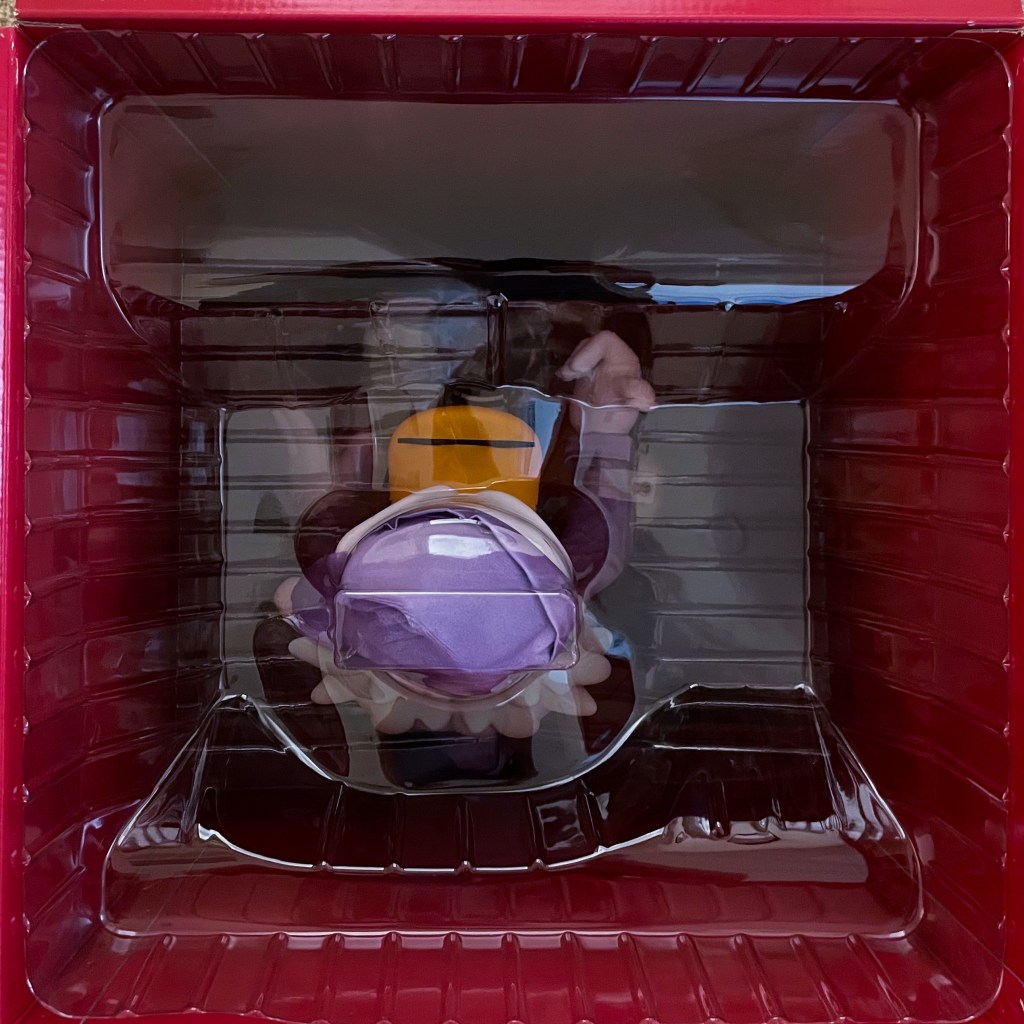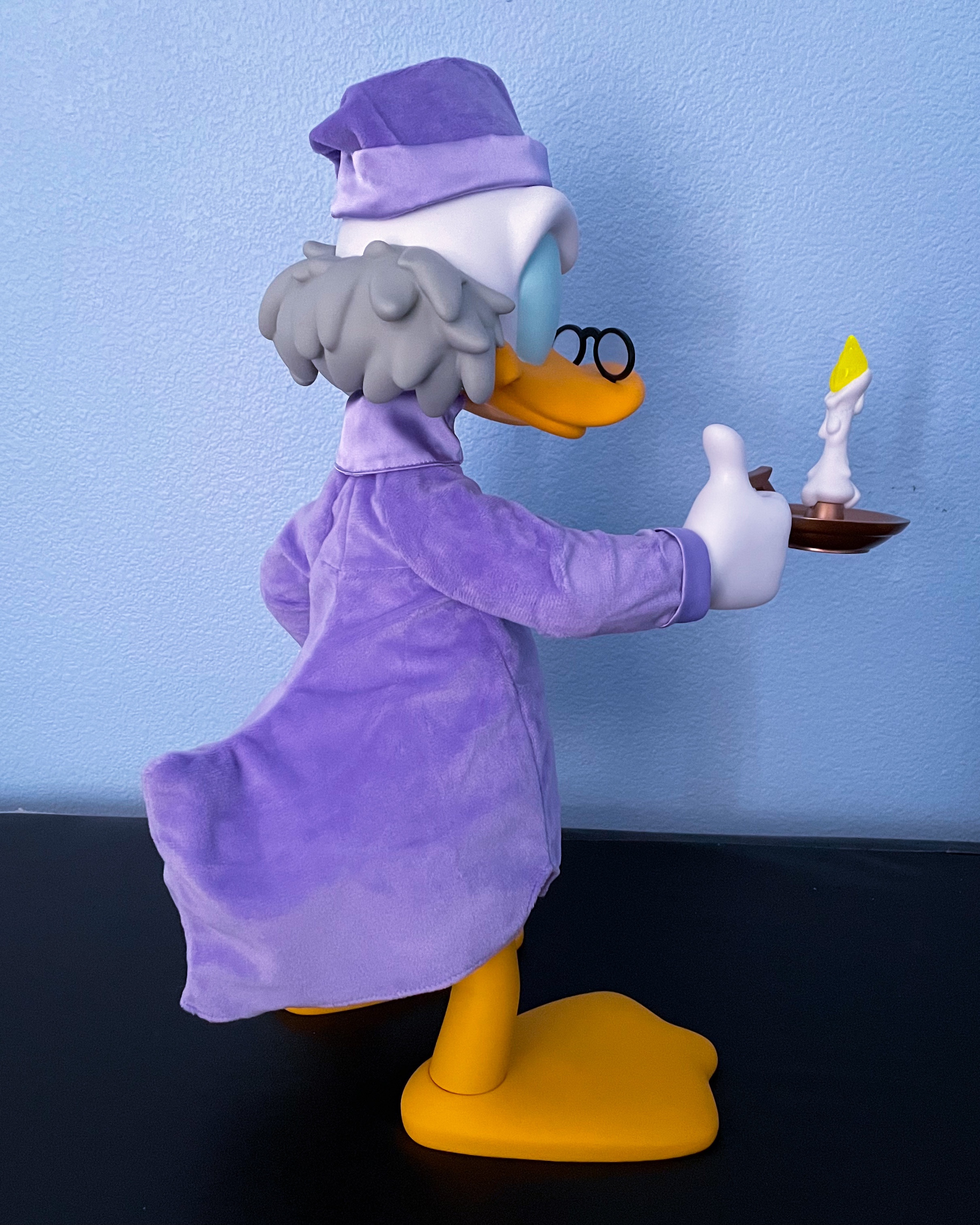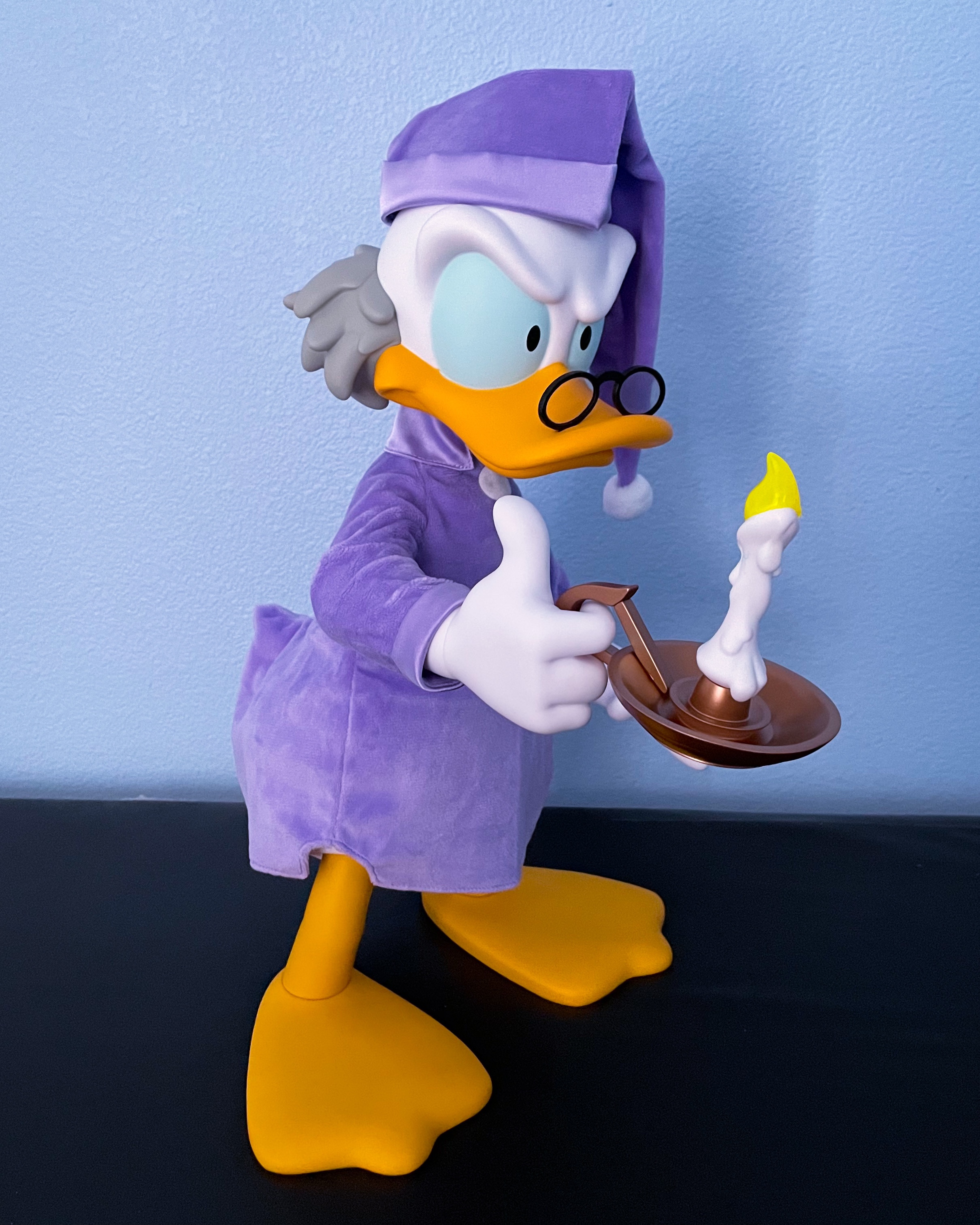 There is absolutely nothing to Bah Humbug about this Super7 Supersize Ebenezer Scrooge figure. The figure is so detailed and expressive that I almost expected Alan Young’s iconic Scrooge voice to start talking to me and asking me what I am doing in his room. The soft goods purple nightgown and cap look really comfy and authentic to the outfit that Ebenezer Scrooge wears to sleep in Mickey’s Christmas Carol. Ebenezer stands around 18 inches tall and has nine points of articulation including his head, arms (2), wrists (2), legs (2), and feet (2).