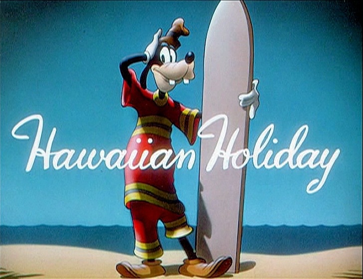 Goofy spends all of his time trying to surf in Hawaiian Holiday.
