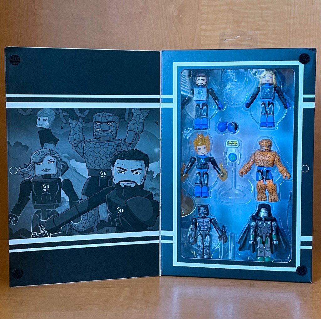 The front of the box opens as a flap to reveal a black and white version of the illustration from the front of the box as well as a window packaging view of all six of the Minimates figures in this Fantastic Four set.