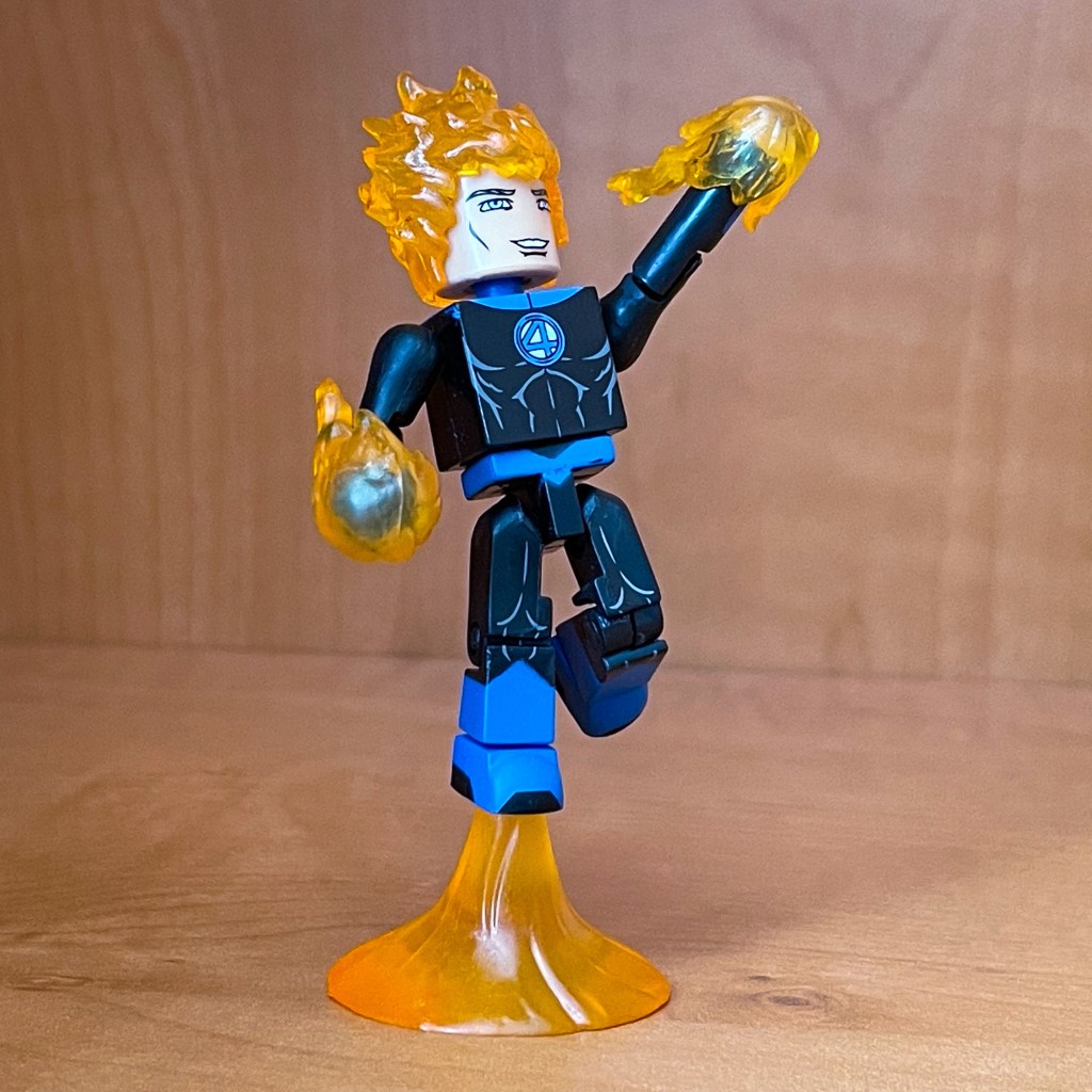 The Human Torch has orange translucent flame hair and hands as well as an orange flame flight stand so that he cane be posed flaming on.