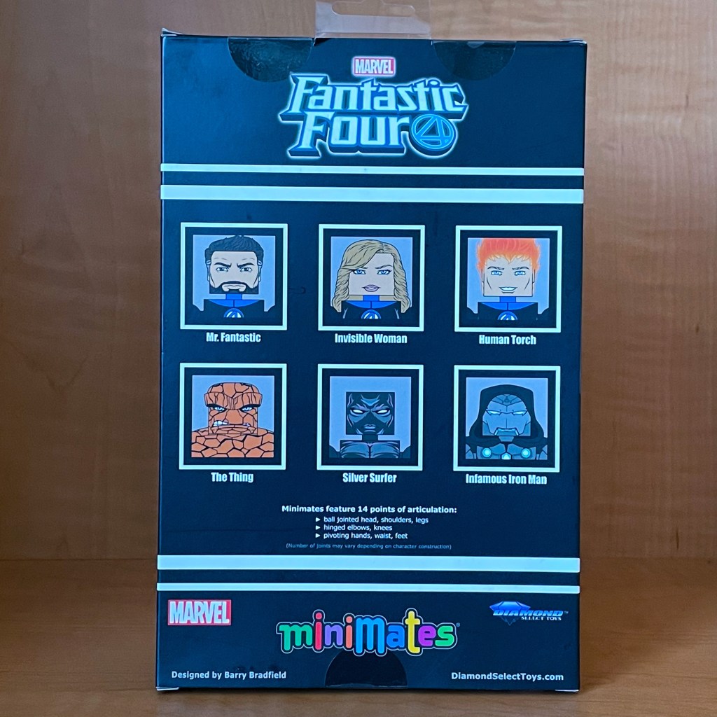 A Fantastic Four box set of six new figures recently joined the Marvel Minimates family to help celebrate the 20th anniversary milestone of Diamond Select Toys Minimates. In addition to the four main Fantastic Four members (Mr. Fantastic, Sue Storm, Human Torch, and the Thing), Silver Surfer and Infamous Iron Man are included in this figure set.
