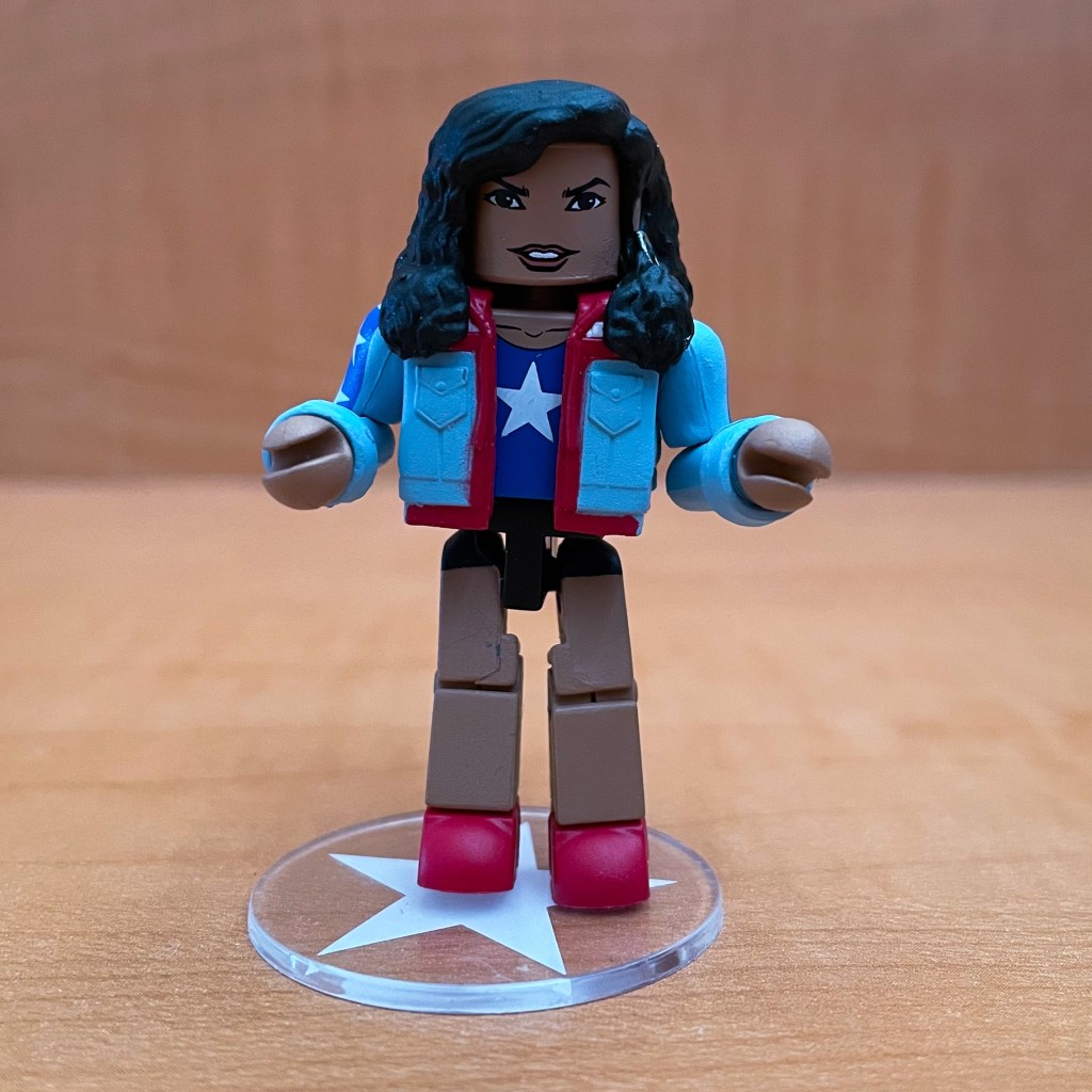 America Chavez first appeared in comics in 2011, but MCU fans will remember her from the Dr. Strange and the Multiverse of Madness MCU movie from 2022. America Chavez’s circular base has a star on it that represents her star portal. She also has that same star on her shirt and the back of her jacket.