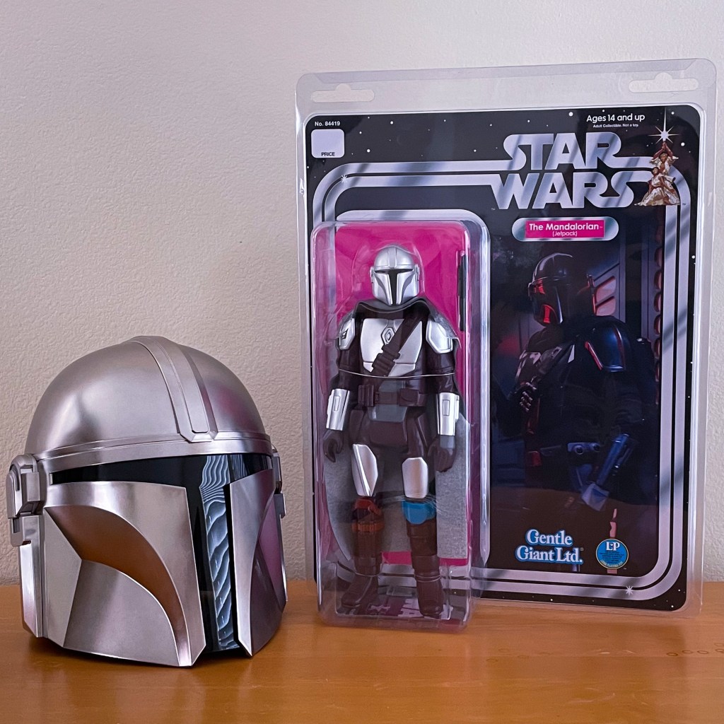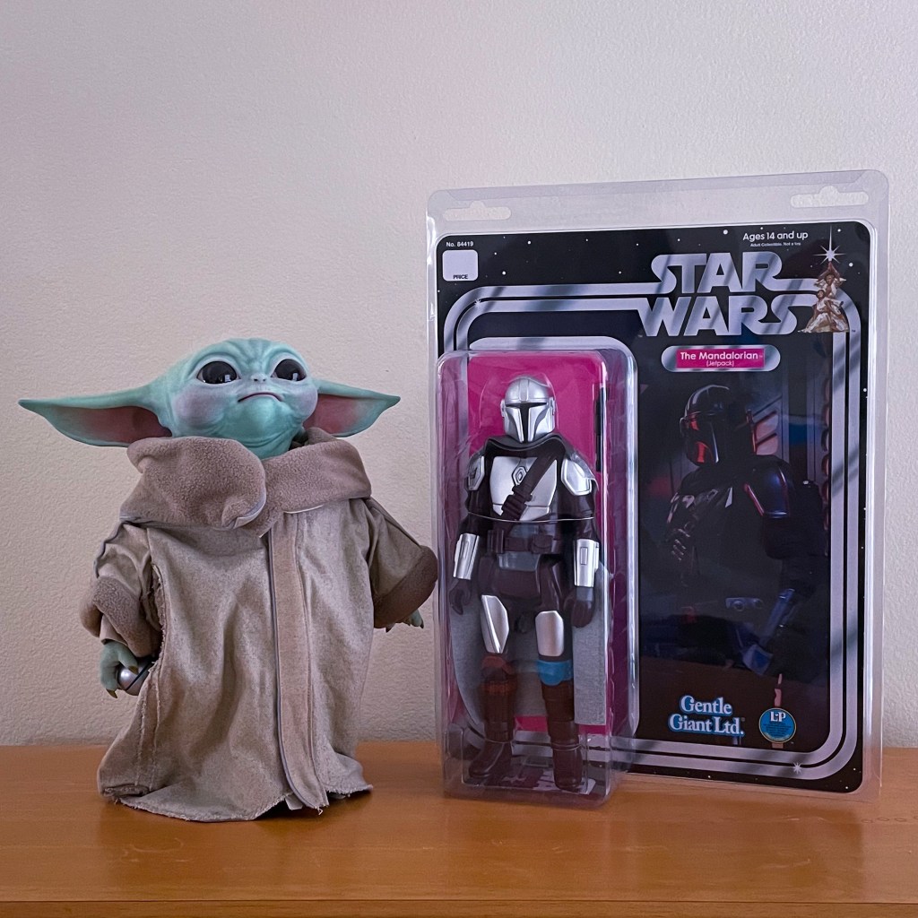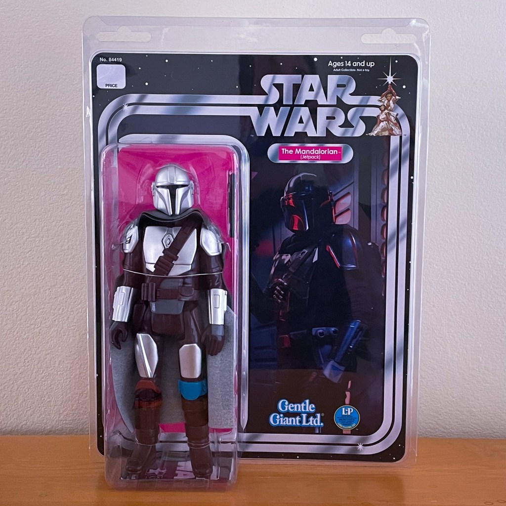 The Din Djarin Mandalorian character was obviously not around during the classic Star Wars Kenner action figure days. The look of those original Star Wars action figures is so nostalgic and still loved today. Hasbro released a retro collection of characters from the Mandalorian after the first season of the show aired on Disney+. In the below picture, you can see the size difference between the Hasbro 3.75 inch retro figure and the 1:6th scale 12 inch jumbo edition figure from Gentle Giant LTD.