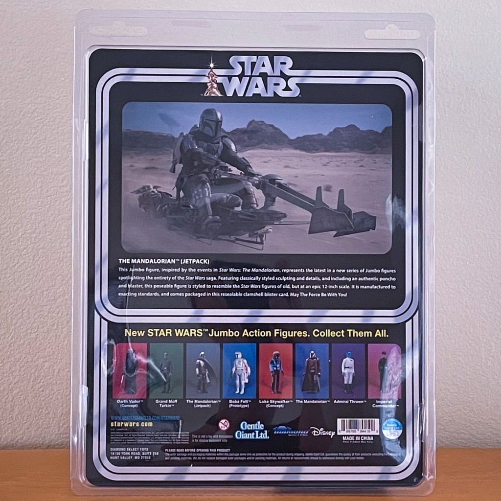 The back of the card features a picture of Mando on a speeder bike with Grogu. There are also pictures of other Gentle Giant LTD vintage jumbo figures in the series. It is seriously a great selection of characters, and I will definitely be on a lookout for the jumbo figure of The Mandalorian in his original armor. Other jumbo figures pictured include Darth Vader (Concept), Grand Moff Tarkin, Boba Fett (Prototype), Luke Skywalker (Concept), Admiral Thrawn, and Imperial Commander. Gentle Giant LTD has a lot more characters than that on their official website store.