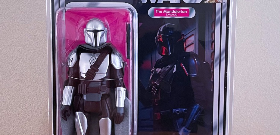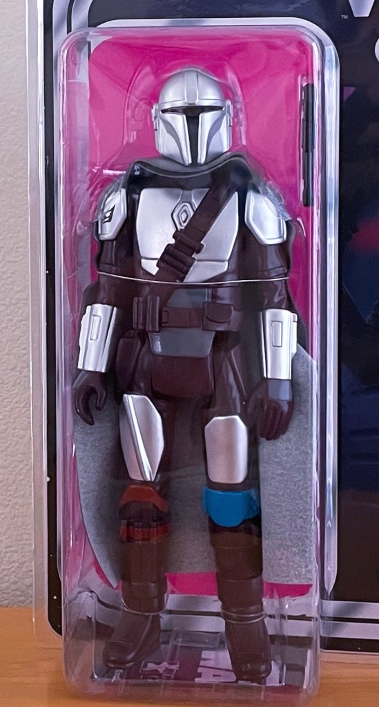 Whenever I think of classic Star Wars toys and collectibles, it is always the original Star Wars Kenner action figure lineup. Mando is currently my favorite Star Wars character. I have a lot of Star Wars Mandalorian products and memorabilia in my collection, but this one could stand out as one of the coolest. The key word for this one is obviously jumbo. So make sure that you have a place to display it or even hang it on the wall. The jumbo figure is removable from the package to display out of the package, but to me the way it is packaged makes it feel more like art and this is the way that this piece of art is going to be displayed.