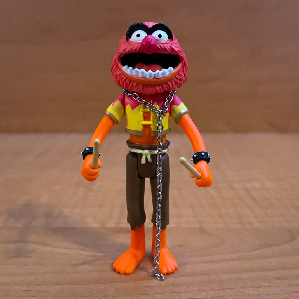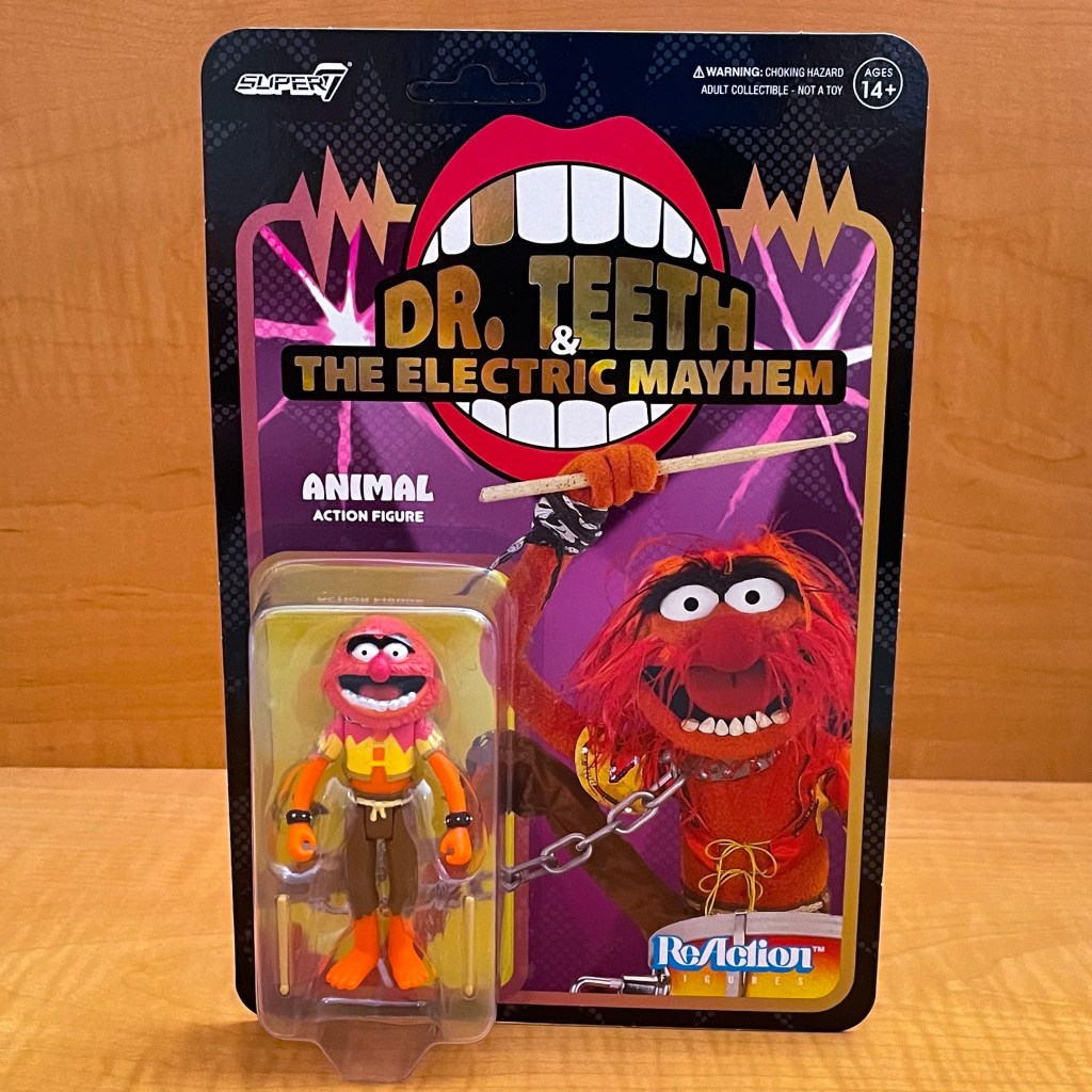 The Super7 Muppets Animal ReAction figure has five points of articulation: head, arms (2), legs (2). Animal comes with his chain leash and drum sticks as accessories.