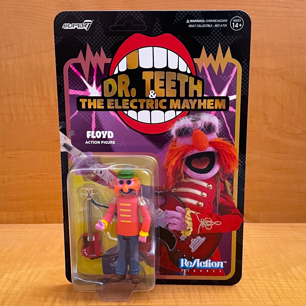 The Super7 Muppets Floyd Pepper ReAction figure has five points of articulation: head, arms (2), legs (2). Floyd Pepper comes with his bass guitar as an accessory.
