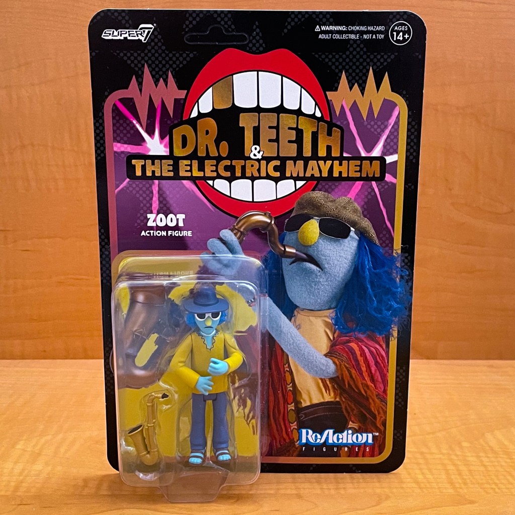 The Super7 Muppets Zoot ReAction figure has five points of articulation: head, arms (2), legs (2). Zoot comes with his saxophone as an accessory.