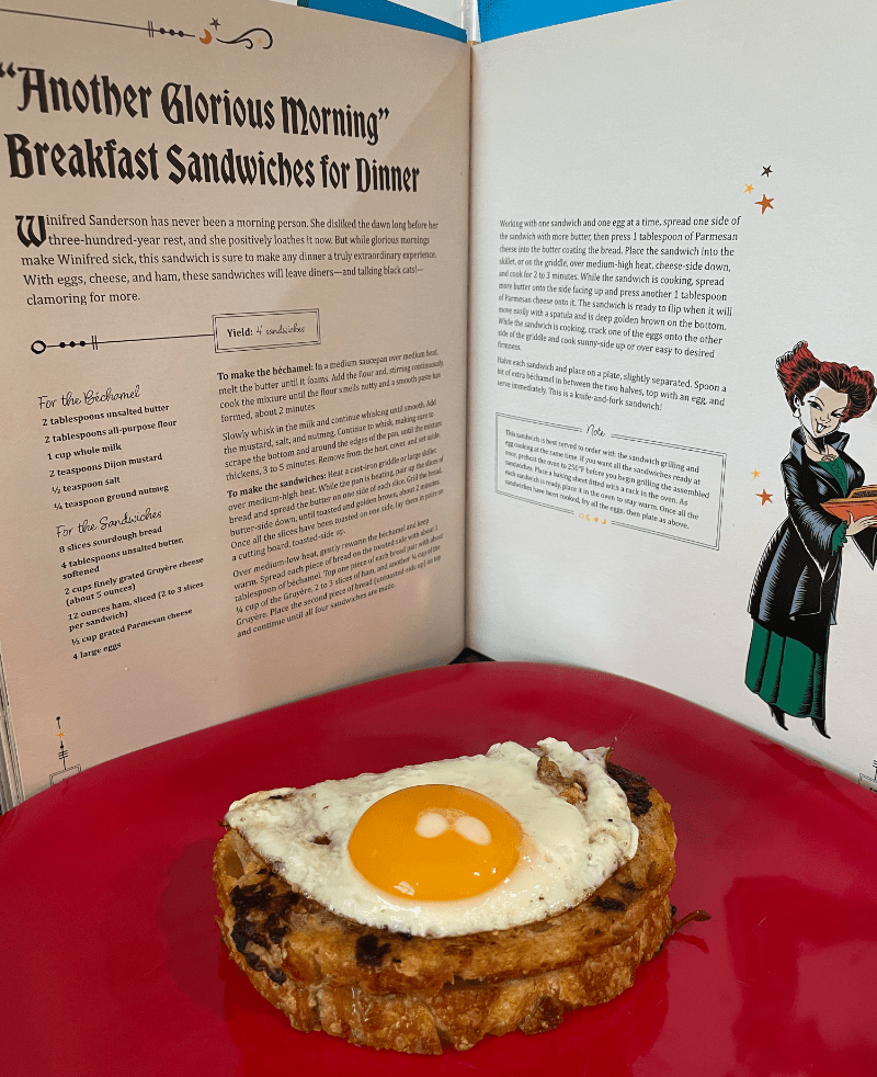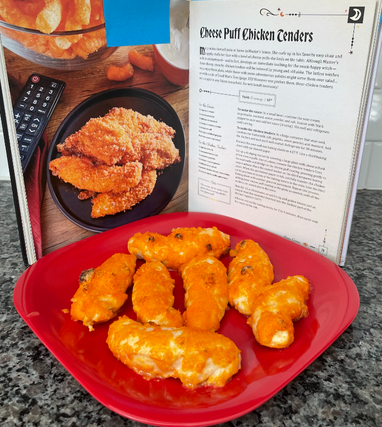 We decided to put this cookbook to the test and try out a few recipes for ourselves. As I’ve come to expect from Insight Edition cookbooks, the process was fun and stress-free. Required tools and ingredients were clearly listed and easy to track down. Instructions were direct and helpful, offering tips and substitutions along the way. We chose to create two dishes: The “Another Glorious Morning” Breakfast Sandwich and the Cheese Puff Chicken Tenders. The breakfast sandwich was easy to put together, and in the end, taught me a great new technique to make grilled sandwiches. While glorious mornings make Winnifred Sanderson sick, the sandwich equivalent just left everyone feeling full and content! The Cheese Puff Chicken Tenders were equally as fun to put together. Admittedly, something ran amok in my process. That’s no fault of the recipe – they probably just could’ve used a few more minutes in the cauldron. While I didn’t nail the crispy texture of the example photos, they were still delicious and definitely a spell we want to recast soon.