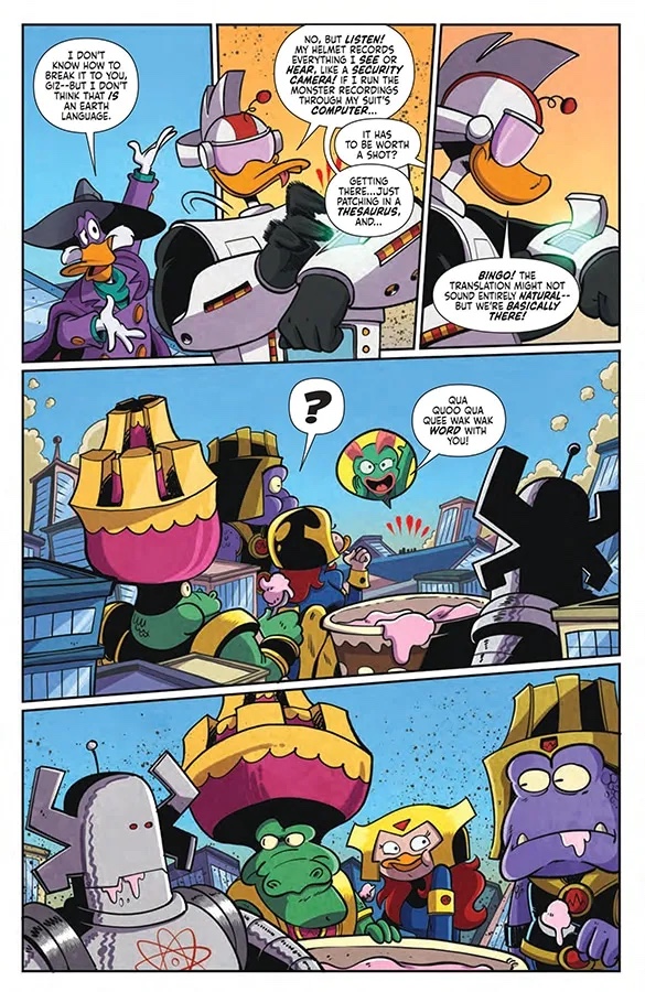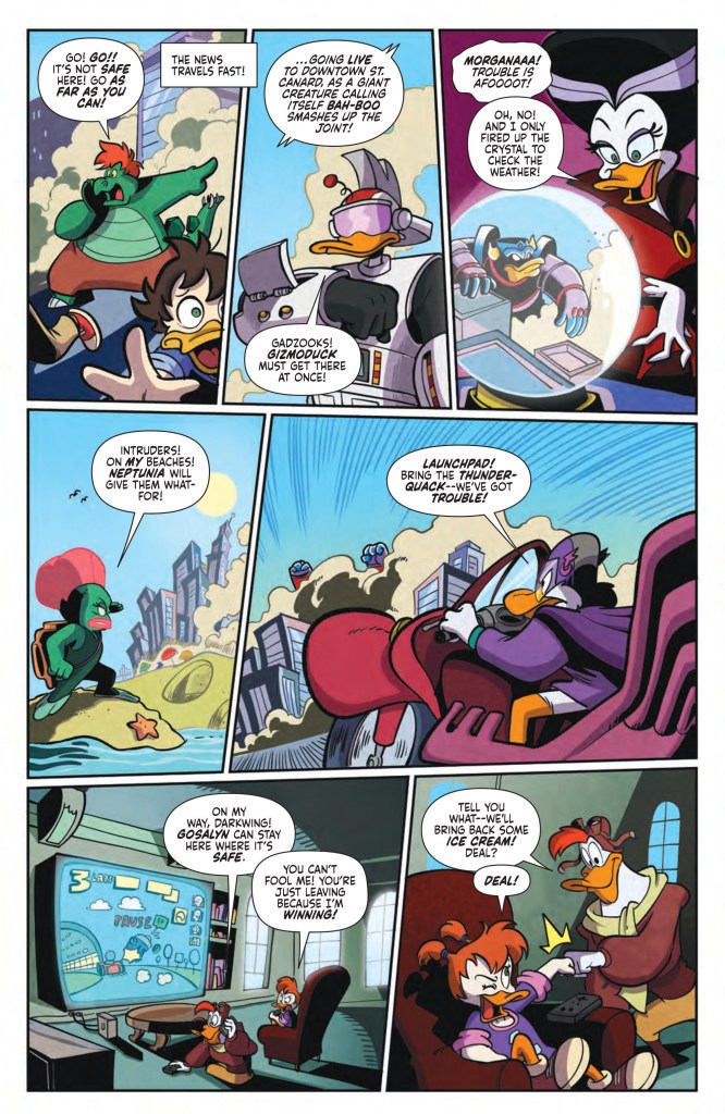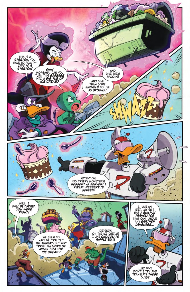 In this thrilling maiden issue: Flying saucers descend from the skies, to (maybe) wreak (possible) havoc upon the (mostly) innocent citizens of St. Canard! All that’s stopping these aggressive alien agitators is STEGMUTT, GIZMODUCK, NEPTUNIA, MORGANA, and (most important, in his opinion) DARKWING DUCK!