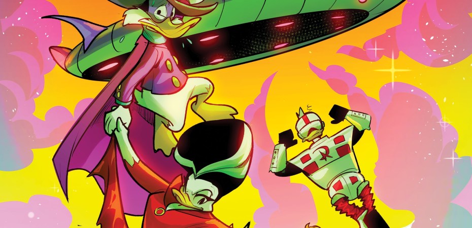 In this thrilling maiden issue: Flying saucers descend from the skies, to (maybe) wreak (possible) havoc upon the (mostly) innocent citizens of St. Canard! All that’s stopping these aggressive alien agitators is STEGMUTT, GIZMODUCK, NEPTUNIA, MORGANA, and (most important, in his opinion) DARKWING DUCK!