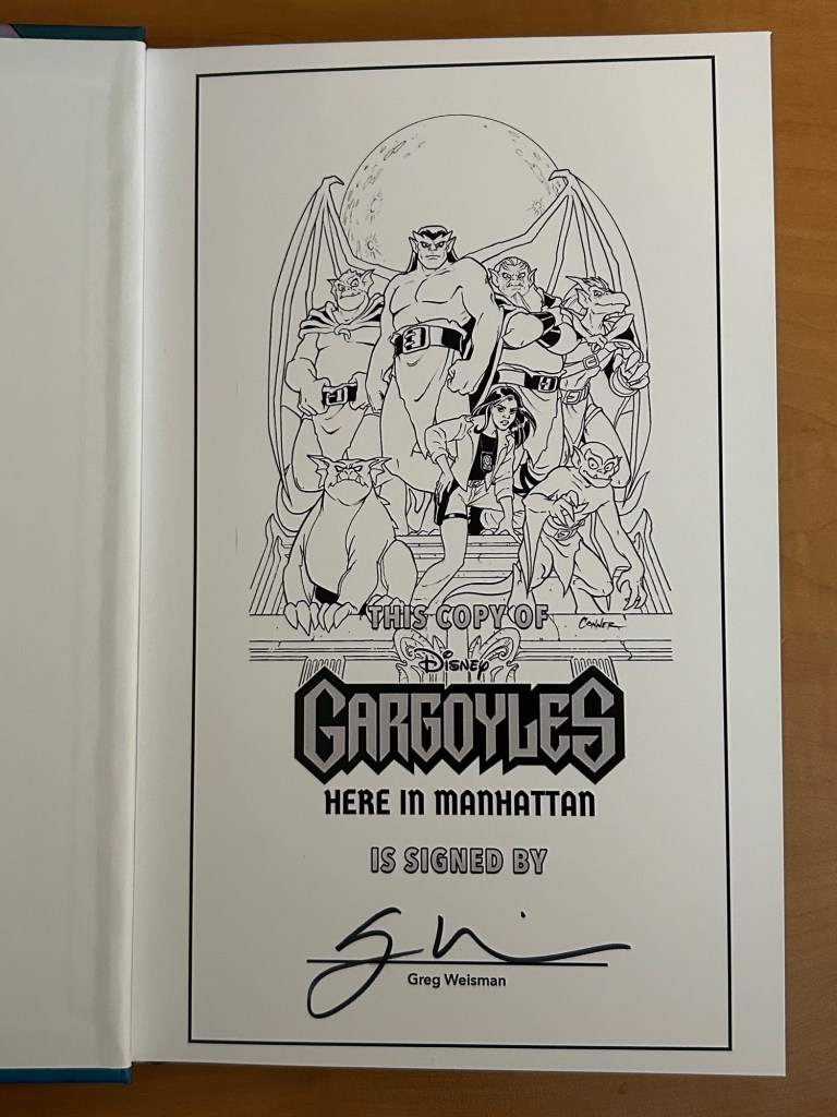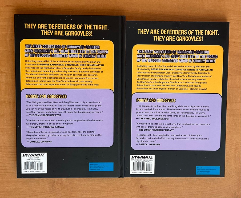 Gargoyles Here in Manhattan Vol. 1 collects issues #1-6 and was released in paperback, hardcover, and hardcover signature editions signed by Greg Weisman. Each collected edition For Gargoyles Vol. 1 had a different featured cover artist. The paperback edition features David Nakayama’s cover from Gargoyles #1. The hardcover edition features Amanda Conner’s cover from Gargoyles #1. The Hardcover signature edition features Jae Lee’s cover from Gargoyles #1. Special features include a complete cover gallery and behind the scenes process page samples of the script matched up with illustrations from a few of the issues. I have pictures of the hardcover signature and paperback editions below for comparison.