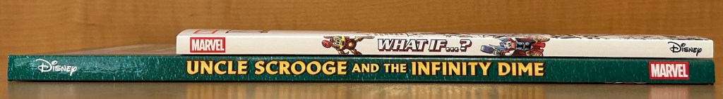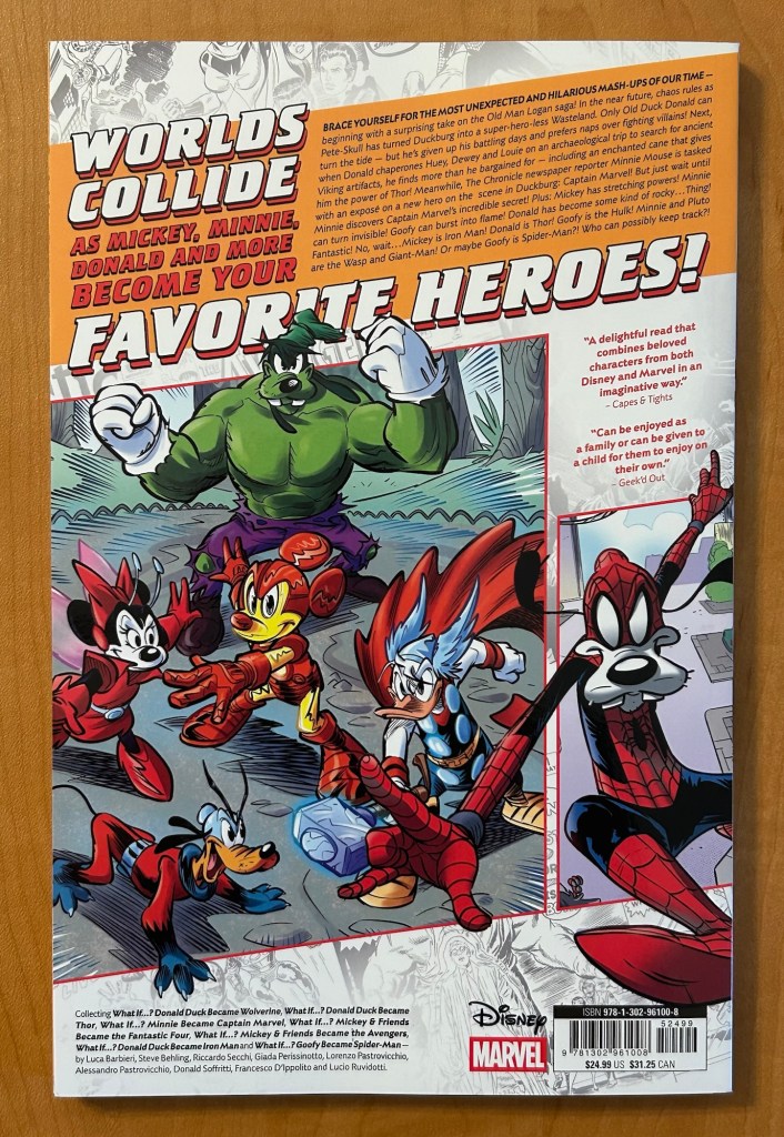 The complete collection of the Marvel & Disney: What If…? is available in a standard comic book size trade paperback. There is no hardcover edition. The collection is also available in a digital format edition. The collection currently retails for $24.99 in the trader paperback and $19.99 in the digital edition. The trade paperback is 224 pages. The book would look great on your bookshelf next to your other Marvel or Disney comics. Mickey Mouse as Iron Man and Donald Duck as Thor are on the spine of the trade Marvel & Disney: What If…? paperback.