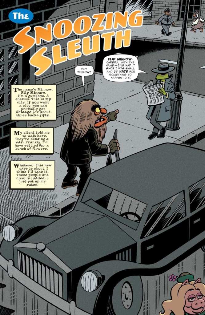 Muppets Noir takes this desire a step further, asking the question “What if the Muppets not only took on a mystery, but rather the whole genre that has defined them for decades?” It’s certainly ambitious, and while the Muppets are always up to the task, it helps that they are being written and illustrated by Eisner Award-nominated Roger Langridge. Langridge’s prior work with the Muppet Show Comic Book is one of my favorite comicruns of all time, as he transitioned the Muppets from stage to page flawlessly.