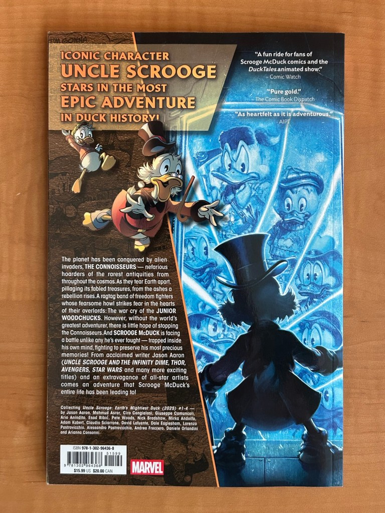 In the summer of 2024, Marvel published a blockbuster one‑shot event titled Uncle Scrooge and the Infinity Dime. Written by longtime Uncle Scrooge fan Jason Aaron, the issue marked Scrooge McDuck’s first-ever Marvel sized action adventure. The comic became a standout success and ended up being one of my favorite pieces of media from that summer. Jason followed Uncle Scrooge and the Infinity Dime with a four issue mini series Uncle Scrooge: Earth’s Mightiest Duck. You can click on any of the links below to read my review of each individual issue.