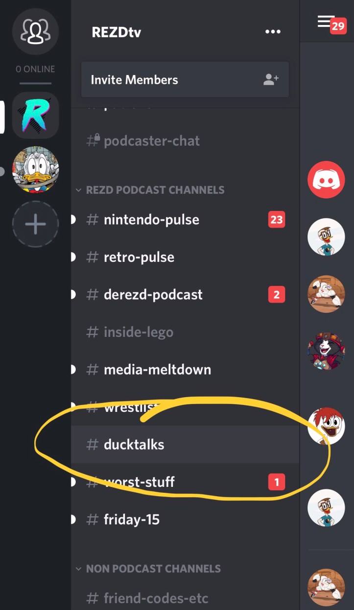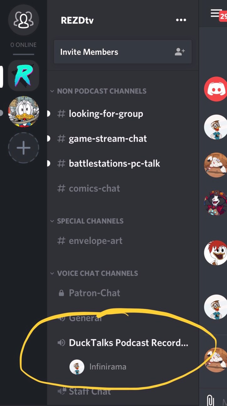 After you have joined the server you will need to scroll to the bottom of the REZDtv channel list to find the Voice Chat Channels and select the one called DuckTalks Podcast Recording.